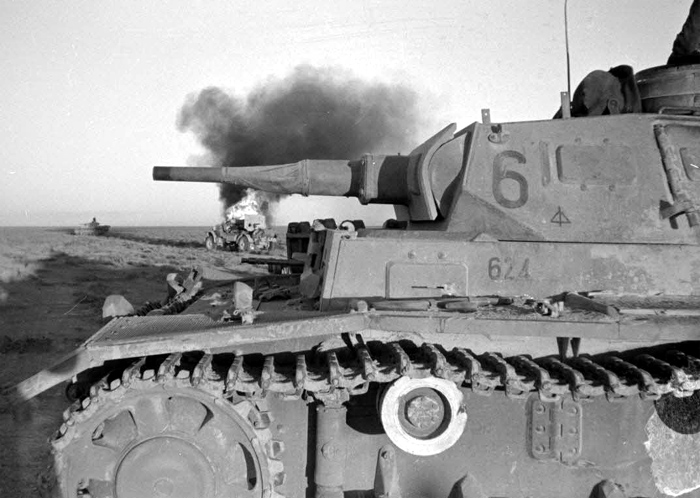 věžové číslo na tomto PzKpfw IV nám prozrazuje, že jde o čtvrtý tank, druhé čety, osmé roty (a my dále víme, že patří do 5. tankového pluku, 5. lehké divize a právě stojí v ulicích Libyjského přístavu Tripolis), povšimněte si, že číslo je vyvedeno postaru na odnímatelné kosodélníkové destičce a zároveň ponovu přímo na věži, zdroj: Flickr.com se souhlasem publikujícího uživatele, upraveno