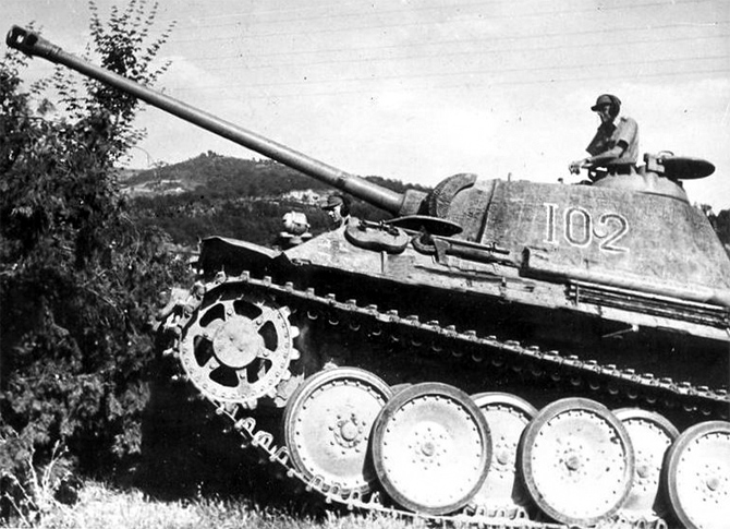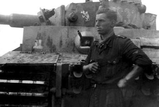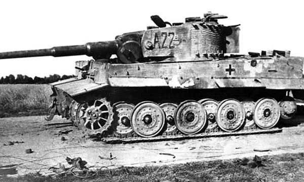 opět krásná ukázka "kompletního" značení tanku: trámový kříž, znak 31. tankového pluku (hlava čerta na boku věže), znak 5. tankové divize (symbol X na boku korby) a věžové číslo 814 (zde hůře viditelné, neboť bylo nejspíš vyvedeno v červené barvě... stejně jako hlava čerta), zdroj: Bundesarchiv_Bild_101I-271-0302-26, Wikimedia, Creative commons, upraveno