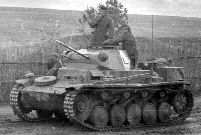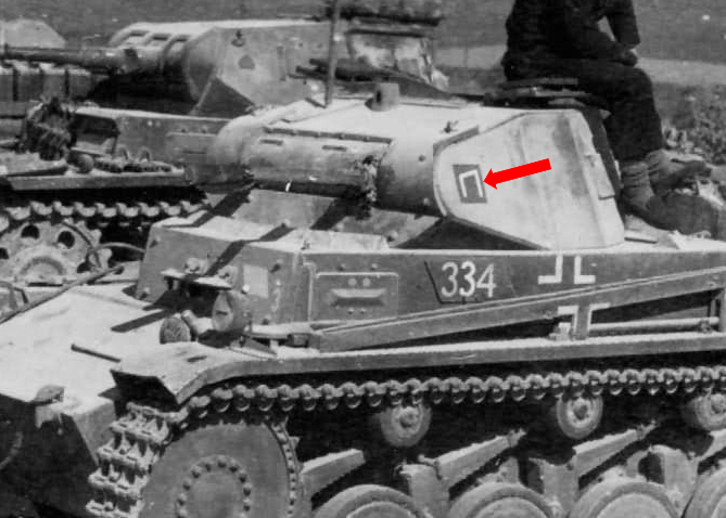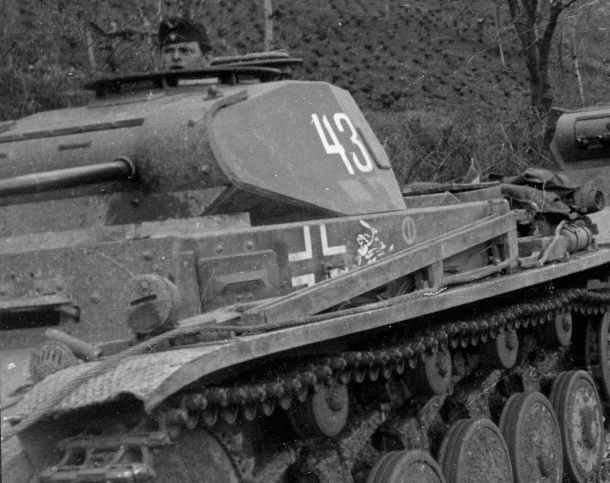 Panzer II plný značek: žlutý rozpůlený kruh je znakem 11. tankové divize, duch je doplňkovým znakem téže divize, pak je zde obligátní trámový kříž a dvouciferné věžové číslo s barevným kosodélníkem pod ním, což byla specialita používaná právě u 11. tankové divize (resp. u 15. tankového pluku), zdroj: Flickr.com se souhlasem publikujícího uživatele, upraveno