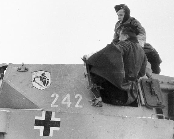 další krásná ukázka různého značení na boku tanku Panzer IV: trámový kříž, věžové číslo a symbol 18. tankového pluku (rytíř s mečem a štítem), zdroj: Bundesarchiv_Bild_101I-273-0446-26, Wikimedia, Creative commons, upraveno