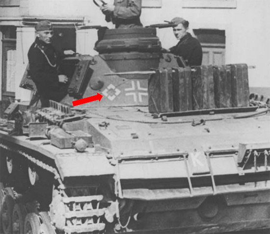 Národním symbolem používaným na německé bojové technice byl notoricky známý trámový kříž (Balkenkreuz). V německé armádě byl tento znak poprvé zaveden v dubnu 1918, aby nahradil původní kříž s rozšířenými konci ramen (tzv. Tatzenkreuz) na německých letadlech a tancích. Tehdy byl používán v černé barvě na bílém poli, nebo jen s tenkým bílým obrysem (foto ZDE). Ke znovu zavedení trámového kříže došlo v rámci Wehrmachtu již v roce 1935, ale na tancích nebyl reálně používán v podstatě až do začátku druhé světové války. Během předválečných manévrů nebylo takové permanentní označení tanků potřebné. Teprve v červenci 1939, méně než 2 měsíce před útokem na Polsko, vydalo armádní velení rozkaz, který nařizoval urychleně opatřit všechny tanky, velitelské tanky, obrněné automobily a obrněná radiovozidla trámovými kříži v bílé barvě pro jasné odlišení od bojové techniky nepřítele. Rozkaz prý doslova říkal, že bojová vozidla spatřená bez tohoto znaku mají být považována za nepřátelská.