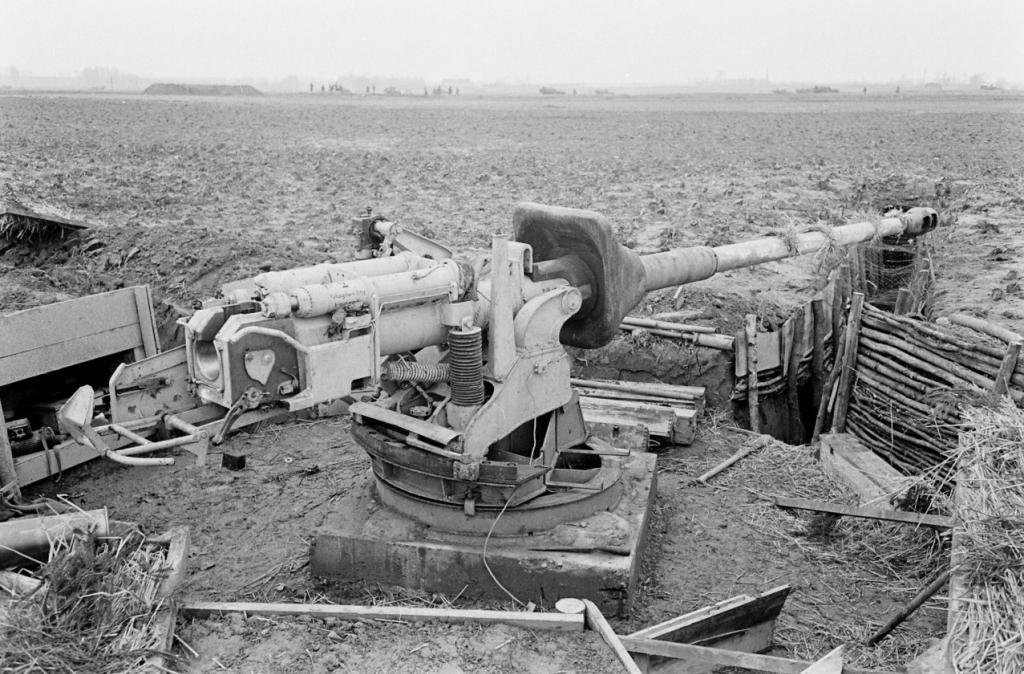 kanon PaK 43 L/71 ze stíhače tanků Jagdpanther v pevném palebném postavení, všimněte si, že kanon má kvůli vyvážení zachován odlévaný štít, zdroj: Flickr.com, Public domain, upraveno