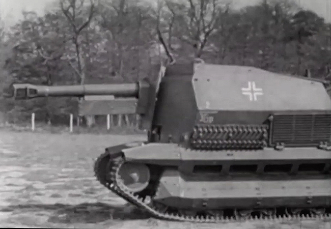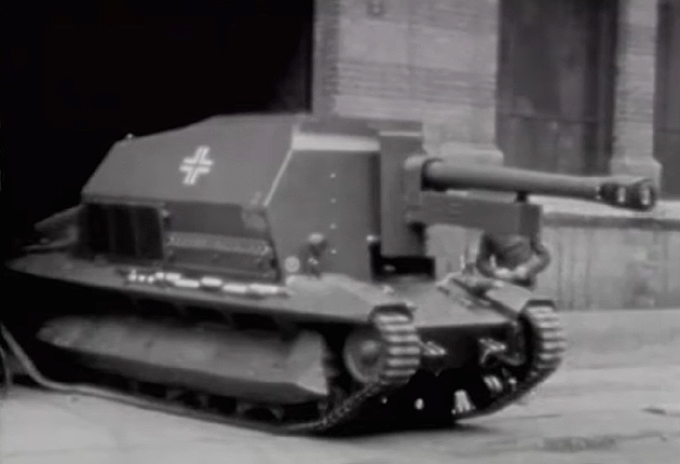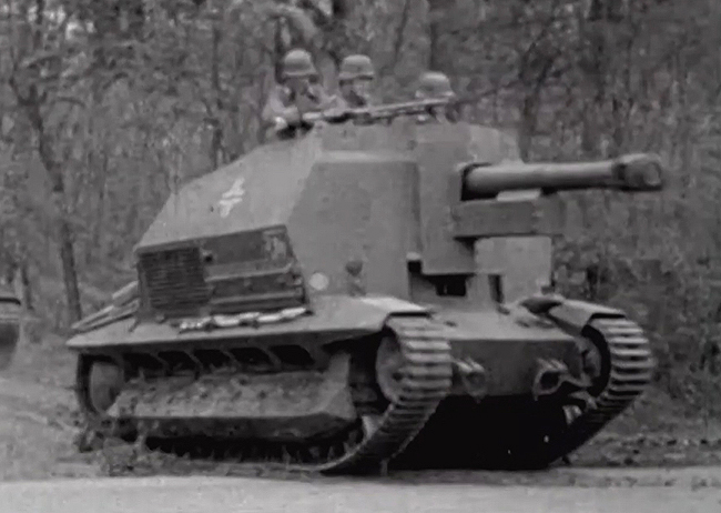 10,5 cm leFH 16 (Sf.) auf Geschützwagen FCM 36(f) vyjíždí z tovární haly, zdroj: Youtube.com, Public domain, upraveno