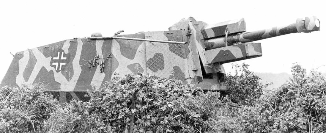 V čelní stěně bojového prostoru byl výřez, kterým procházela hlaveň houfnice. Zvenku byl tento výřez překryt širokým štítem, který se při natáčení do stran pohyboval společně s hlavní. Řekli jsme si, že vozidlo bylo vyzbrojeno houfnicí ráže 105 mm, ale neřekli jsme si jakého typu... ony to totiž byly hned typy dva. Většina vozidel (soudě minimálně podle četnosti fotografií) dostala houfnici typu leFH 18 (leFH = leichte Feldhaubitze), část vozidel však nesla podstatně starší model leFH 16. Rozeznání obou je přitom velmi jednoduché, neboť starší leFH 16 měla pouze jednodílné brzdovratné zařízení, jehož píst byl umístěn pod hlavní. Naproti tomu novější a výkonnější leFH 18 měla brzdovratný „válec“ jak pod, tak i nad hlavní (srovnávací foto ZDE). Obě zbraně používaly stejné granáty, z nichž ten nejběžnější tříštivotrhavý vážil 14,81 kg. Starší leFH dokázala tento granát poslat do vzdálenosti maximálně 9225 metrů. To maximální dostřel leFH 18 byl skoro o 1,5 kilometru větší. Je nicméně pravděpodobné, že při instalaci zbraně na poměrně lehký podvozek Hotchkiss bylo přistoupeno k zákazu střelby nejsilnější výmetnou náloží, takže reálný dostřel samohybky byl nejspíš menší než výše uvedené hodnoty.
