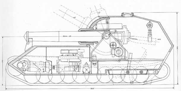 na tomto nákresu samohybného moždíře Bär je vidět vnitřní jeřáb pro manipulaci s granáty i zákluz zbraně do otevřené podlahy, zdroj: Flickr.com, upraveno