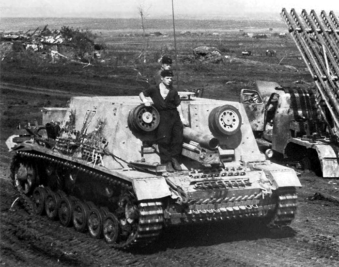 Sturminfanteriegeschütz 33 míjí vrak ruského raketometu Kaťuša, zdroj: Flickr.com se souhlasem publikujícího uživatele, upraveno