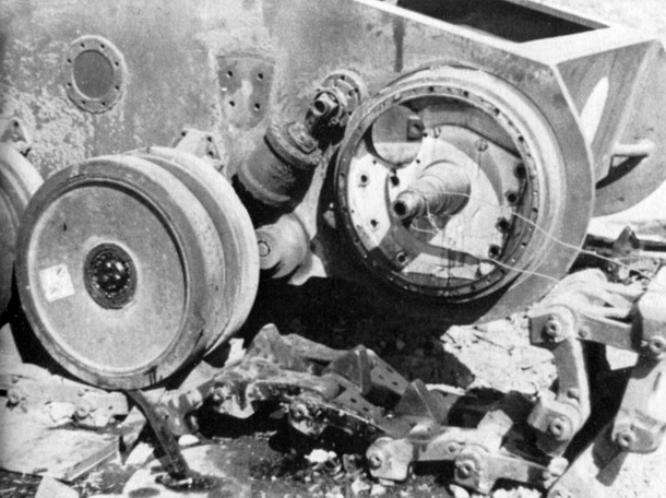 jedna ze dvou známých fotografií prototypu tanku Durchbruchswagen ukazuje detail osy pro přední hnací kolo a první pojezdové kolo s tlumičem, zdroj: internet, Public domain, upraveno