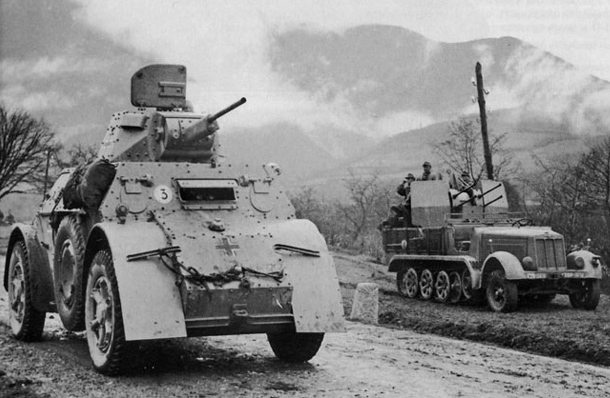 Panzerspähwagen AB41 201(i) a Sd.Kfz. 7/1 bojují proti partyzánům v jugoslávských horách, vozidlo dostalo prodloužení předních blatníků chránící pneumatiky před prostřelením, zdroj: flickr.com se souhlasem publikujícího uživatele, upraveno