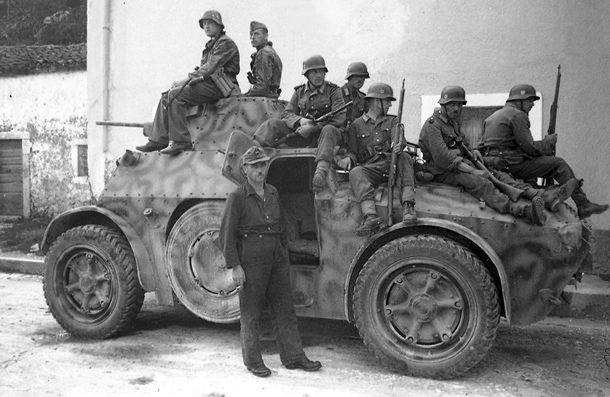 Panzerspähwagen AB41 201(i) obtěžkaný pěchotou se chystá vyrazit na hlídku snad prý někde v okolí jugoslávského města Opatia, zdroj: flickr.com se souhlasem publikujícího uživatele, upraveno