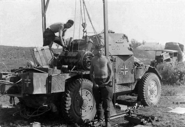 Panzerspähwagen P204(f) během opravy motoru, zdroj: Flickr.com se souhlasem publikujícího uživatele, upraveno