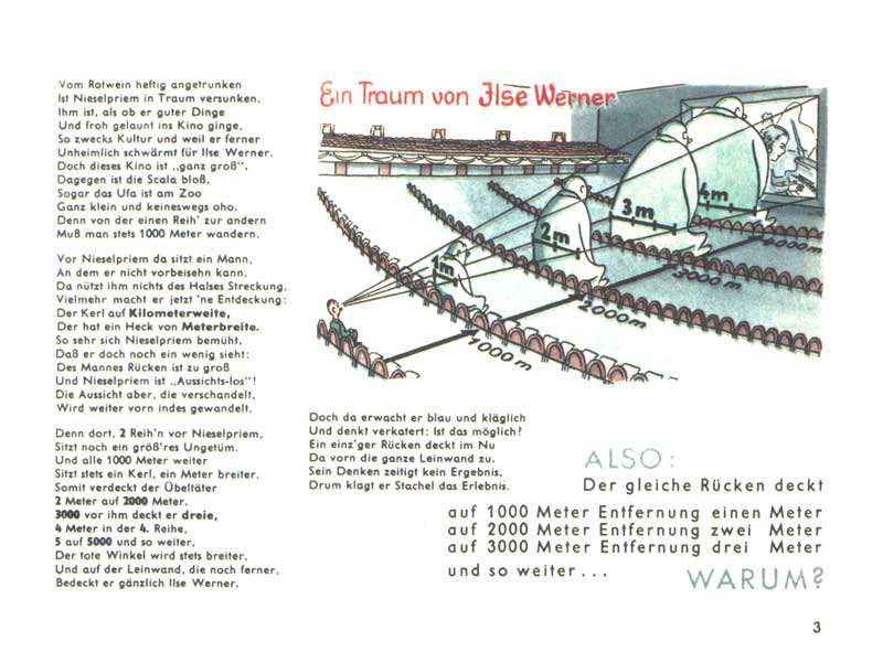 Nieselpriem (česky něco jako "remcal"), opilý červeným vínem usnul a zdál se mu sen, ve kterém šel do kina na film s jeho milovanou Ilse Werner. Bylo to obrovské kino, kde jednotlivé řady sedaček byly od sebe vzdálené rovných 1000 metrů! V řadě před ním seděl velikánský chlap, jehož záda byla široká přesně 1 metr a Nieselpriemovi zakrýval výhled na celé plátno. O řadu dál navíc seděl další obr se zády širokými 2 metry a pak další a ještě jeden, pokaždé se zády o metr širšími. Nieselpriem se probudil a říkal si, je to vůbec možné, aby každý z nich přesně zakrýval toho před sebou a taky celou šířku plátna?