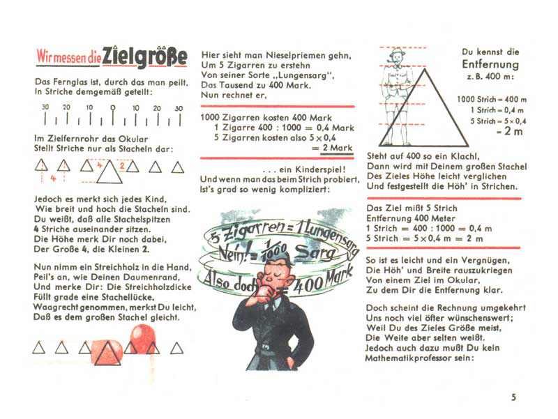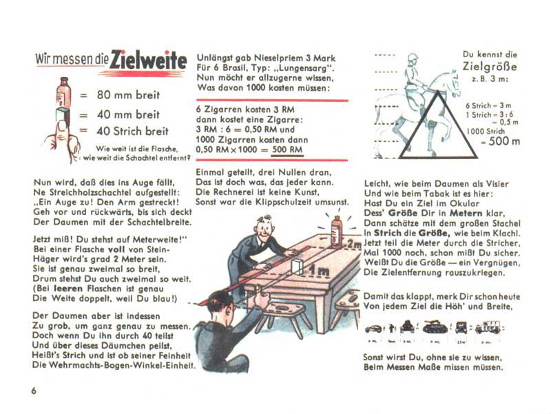 Měříme vzdálenost cíle: Zkus postavit na stůl krabičku sirek. Teď zvedni palec, zavři jedno oko a posouvej se, dokud prst nebude zakrývat celou krabičku. Tvůj palec má šířku cca 40 dílců a krabička sirek je široká cca 4 cm. Takže když palec krabičku zakryje, jsi od ní vzdálený přibližně 1 metr. A když metr za krabičku sirek postavíš ještě lahev Steinhägeru (alkohol podobný ginu), bude také v zákrytu tvého palce, protože její šířka je 8 cm. Pokud znáš rozměry cíle, je tedy možné dopočítat jeho vzdálenost.