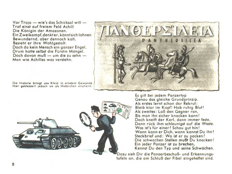 Oproti slavnějšímu Tigerfibelu zde sice chyběla erotika, celkově však byl Pantherfibel podle našeho názoru mnohem hezčí a propracovanější. Ilustrace byly kvalitnější a zpracování jednotlivých témat nápaditější. Za zmínku také stojí fakt, že autoři Pantherfibelu se snažili rozšířit obzory čtenářů i v oblastech, které by člověk v tankovém manuálu rozhodně nečekal. Pro některé situace si třeba brali příklady z antických bájí, takže se tankista mohl například dozvědět, kdo byla královna amazonek Penthesilea (v manuálu vtipně překřtěná na Panthersileu). V jiné části zase manuál vysvětluje, že když nejsou udržovány v pořádku, mohou se kabely na palubě tanku stát zrovna tak nebezpečné jako hadi, kteří zardousili Laokoóna a jeho dva syny ve staré Tróji (a doprovodný obrázek je vyveden přesně ve stylu slavného sousoší z Vatikánského muzea – viz ZDE). Na jiných stránkách můžete zase narazit na citáty, tu od německého spisovatele Wilhelma Busche, jindy zase od francouzského politika George Clemenceau nebo dokonce ze Shakespearova Hamleta.