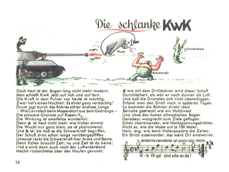 Štíhlý kanon. Dnes už oblouky nejsou v módě. Dnešní tankový kanon (KwK) umí střílet na blízko i do dálky. Síla dnešního střelného prachu a dlouhá hlaveň dělají zázraky, takže i těžký granát dosáhne obrovské počáteční rychlosti. Gravitace po něm marně natahuje ruce a skrz odpor vzduchu se provrtává jako vrtačka. Takový granát letí téměř vodorovně jako pravítko, jako linky notové osnovy.