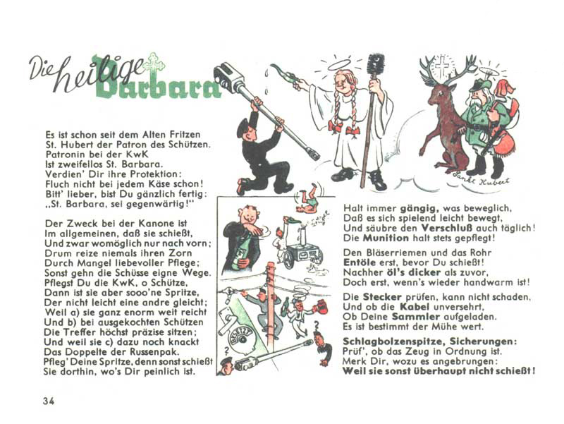 Patronem lovců je sv. Hubert, tvojí patronkou je však sv. Barbora (patronka dělostřelců a pyrotechniků), takže si ji předcházej. Posláním kanonu je střílet, a to, pokud možno směrem vpřed. Tak se o něj starej, pokud nechceš, aby střílel i jinými směry. Zbraň je potřeba čistit a olejovat. Cokoliv se na kanonu hýbe, musí se hýbat snadno a lehce. Pravidelně kontroluj kabely, pojistky, hrot úderníku, uzávěr kanonu, ale také munici.