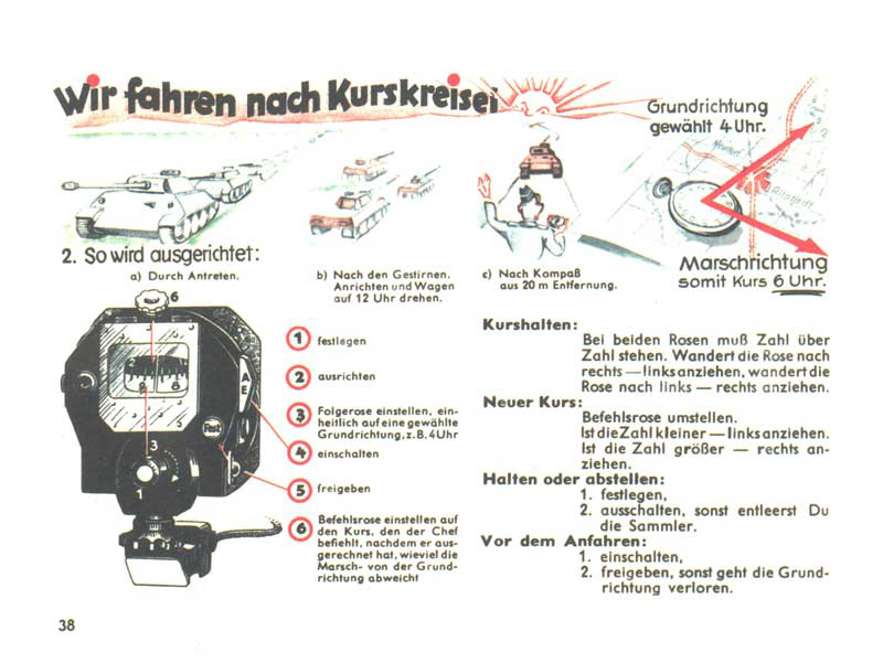 Jedeme podle směrového gyroskopu. Nejprve je třeba tanky srovnat (do řady, podle slunce, nebo podle kompasu). Následně velitel s pomocí mapy a kompasu určí směr, kterým tanky stojí (Grundrichtung) a směr pochodu (Marschrichtung). Aby řidič držel kurz, musí tankem manévrovat tak, aby obě stupnice směrového gyroskopu ukazovaly shodné číslo. Více o tomto přístroji a práci s ním si můžete přečíst ZDE.