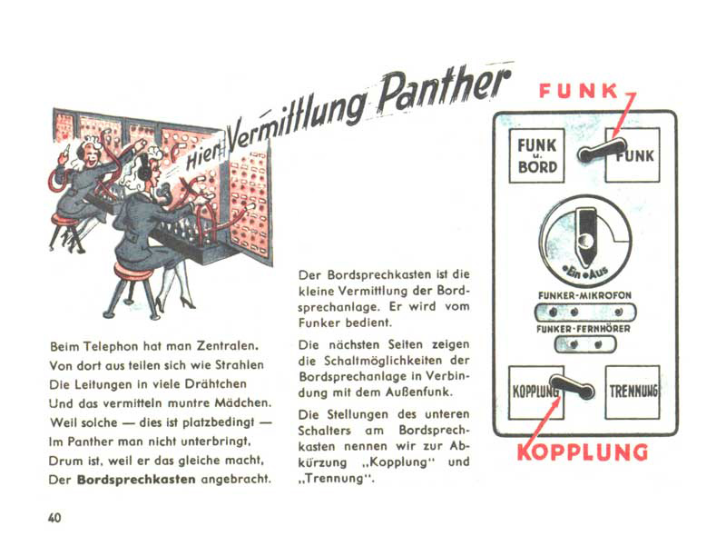 Fungování telefonních linek vyžaduje ústředny, kde veselá děvčata přepojují hovory. Do tanku se taková ústředna nevejde, ale naštěstí je tady palubní hlasová ústředna (Bordsprechkasten), která umí to samé a její obsluhu zajistí radista (Funker).