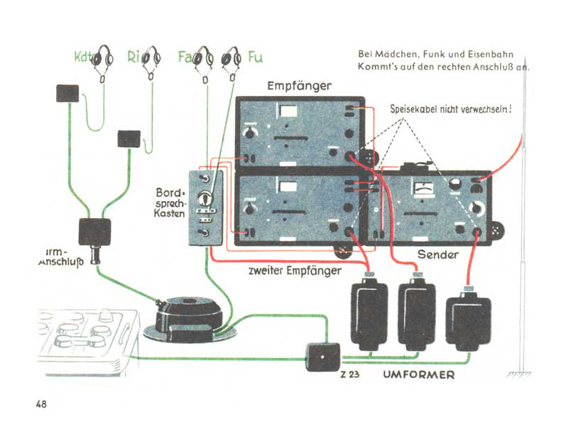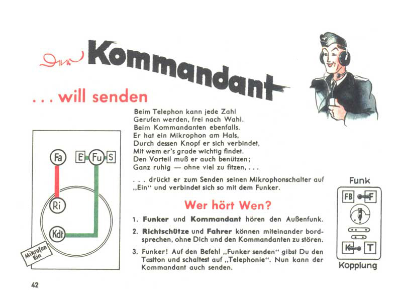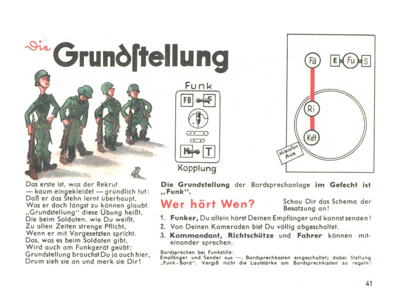 První, co se každý voják musí naučit, je stát v pozoru. To je jeho „základní pozice“ (Grundstellung). Také palubní ústředna má svoji „základní pozici“, kterou musí radista znát, a to je poloha Funk a Kopplung. A kdo při tomto nastavení slyší koho? To ukazuje schéma vpravo (Fu – radista, Fa – řidič, Ri – střelec, Kdt – velitel). Radista jako jediný přijímá a vysílá do éteru, přitom je odpojen od ostatních kamarádů na palubě tanku. Velitel, střelec a řidič se mohou bavit spolu navzájem.