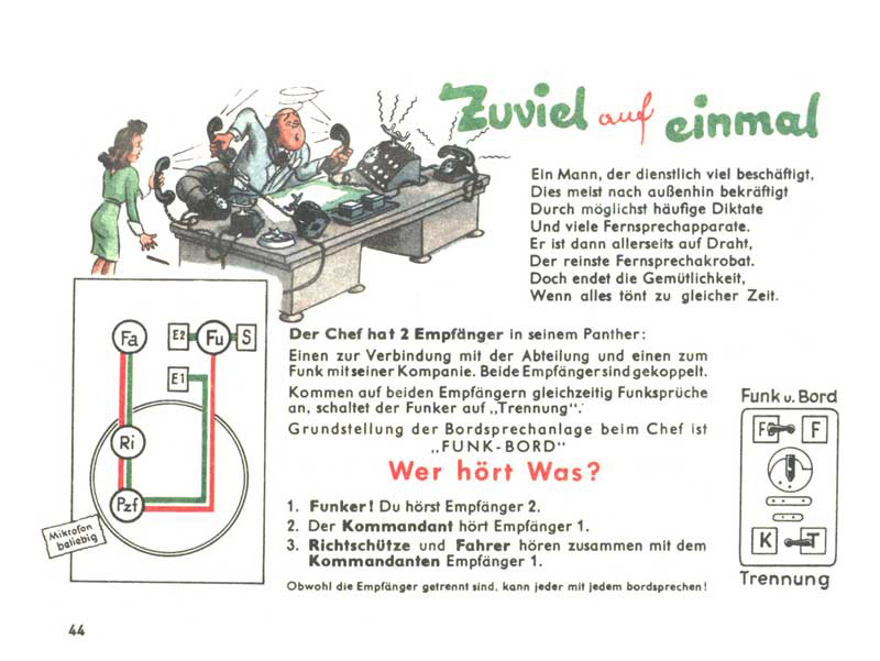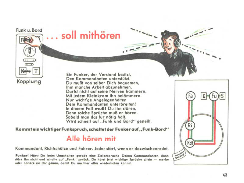 Dobrý radista neobtěžuje velitele tanku s každou hloupostí, kterou uslyší z éteru. Obrací se na něj pouze s důležitými zprávami. A když taková potřeba nastane, přepne ústřednu do polohy Funk und Bord, pak jsou na příjmu všichni (řidič, střelec, velitel i radista). Pokud je velitel bezprostředně zaneprázdněn bojovou činností, nesmí jej radista rušit, musí zprávu převzít sám, zapsat si ji a předat ji veliteli teprve až to bude možné.