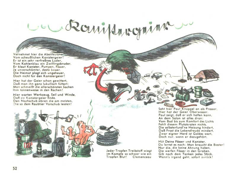 Kapka paliva váží v bitvě stejně jako kapka krve! Tohle je sup kanystrový, velmi chamtivá mrcha, která krade kanystry, pumpy, sudy apod. Tady u marnotratníka Paula Knüppela má sup hody. Pro sebe si Paul umí zařídit pěknou koupelnu i s kamínky, ale o další věci se nestará. Zásobování nejvíce narušují ti, kdo povzbuzují zlodějského supa. Neházejte prázdné sudy do příkopu, zase budou potřeba.
