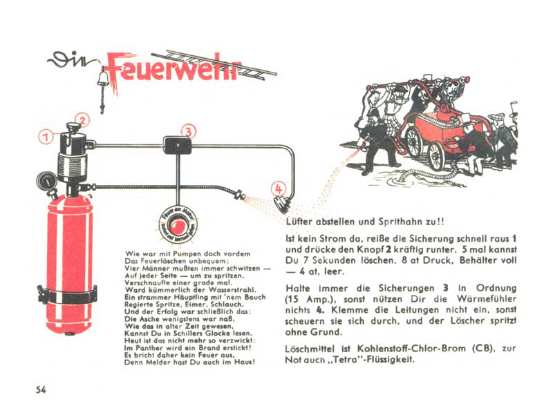 V požárním sboru. Hašení požáru bývalo dříve velmi pracné. Na každé straně stříkačky se potili čtyři chlapi a výsledkem bylo nakonec pouze to, že popel byl alespoň mokrý. Dnes už to tak složité není. Panther má zhášecí systém, takže požár vůbec nepropukne. Pokud se rozsvítí signál požáru motoru urychleně vytáhni pojistku a stiskni tlačítko hašení. Hasiva je dost na pět sedmisekundových hašení.