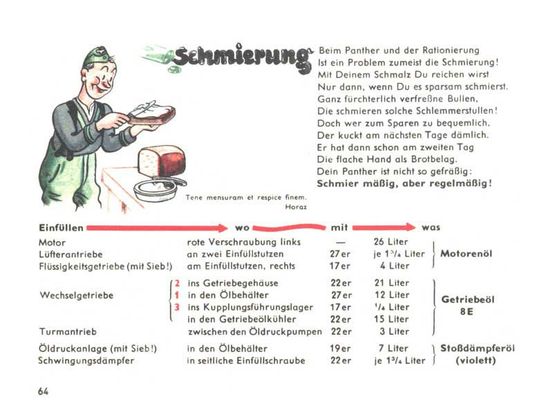 Mazání. S mazáním je to u Pantheru jako u tvé svačiny. Sádlo na chleba musíš mazat tak, abys vystačil. Kdo si jeden namaže velkou vrstvu, bude druhý den jíst suchý chleba. Maž střídmě, ale pravidelně! Kolik čeho kam? 26 litrů oleje do motoru, 21 litrů převodového oleje do převodovky, 3 litry převodového oleje do pohonu otáčení věže atd. atd.