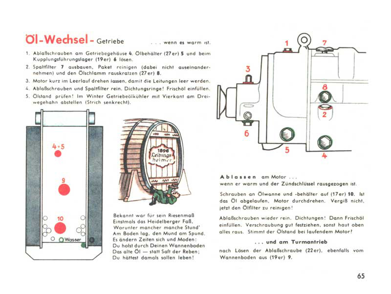 Výměna oleje v převodovce… za tepla. Uvolni vypouštěcí šrouby na těle převodovky (č.4), na olejové nádrži (č.5) a u vodícího ložiska spojky (č.6), povol uzávěr plnícího otvoru a další šrouby dle návodu, nastartuj motor a nech jej chvíli běžet na neutrál, aby se dostal olej i z potrubí, zkontroluj všechna těsnění, nalej nový olej a zkontroluj jeho hladinu. V zimě nezapomeň odstavit chladič oleje. Vypuštění oleje probíhá skrz otvory ve dnu podvozkové vany. Je tedy nutno zalézt si pod tank, jako když chceš pít víno ze sudu. Otvor č.10 slouží k vypouštění oleje z motoru, číslo 9 je pro olej z pohonu otáčení věže a čísla 4+5 patří k již zmiňované převodovce.