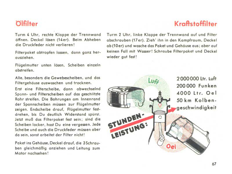 Pokračování návodu pro čištění filtrů, tentokrát pro filtr olejový a palivový. Zajímavé je, že pro přístup k olejovému filtru je nutno natočit věž Pantheru na čtvrtou hodinu, zatímco pro přístup k palivovému filtru musí věž mířit na druhou hodinu. Další „důkaz“ důležitosti pravidelného čištění filtrů: tím vzduchovým projdou každou hodinu provozu neuvěřitelné 2 miliony litrů vzduchu, tím olejovým zase 4 tisíce litrů oleje. Kromě toho dají svíčky za stejnou dobu 200 tisíc jisker a písty motoru běhají nahoru a dolů rychlostí 50 km/h!