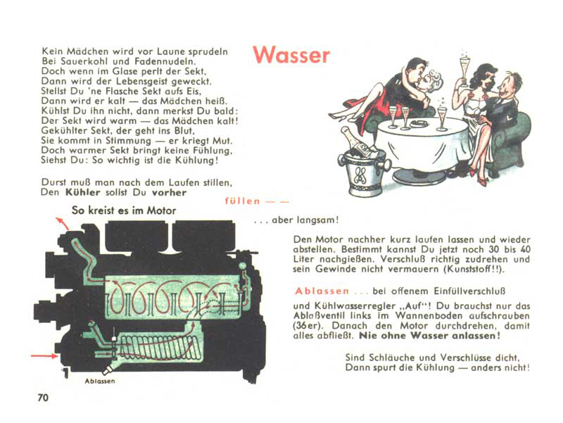 Kysaným zelím a nudlemi holku do nálady nepřivedeš. Ale když ve skleničce zašumí šampaňské, probudí se v ní život. Dobře vychlazené šampaňské dokáže holku pěkně rozpálit, ale když ho nechladíš, začne pití teplat a holka naopak chladnout. Vidíš, jak důležité je správné chlazení! Následuje schéma cirkulace chladící kapaliny v motoru a zjednodušený návod pro plnění a vypouštění chladiče.