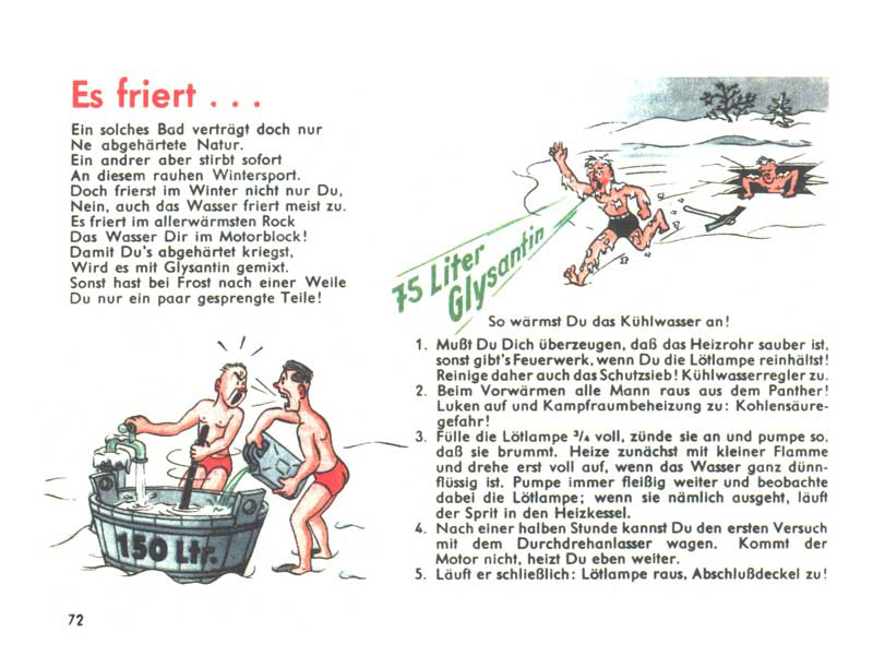 Mrzne. Taková ledová koupel je sport pouze pro tvrdé nátury. V zimě však nemrzneš pouze ty. Ale i voda, a to i ta uvnitř motoru tvého tanku. Musíš ji „posílit“ Glysantinem (nemrznoucí kapalina) jinak ti z motoru zbudou jen roztrhané kusy! A jak zahřát chladící kapalinu pomocí letlampy? Je třeba být velmi opatrný, všichni musí z vozidla ven a průlezy nechat otevřené, aby se předešlo hromadění CO2 v tanku. Letlampu pusťte nejprve pouze na malý plamen a pumpujte kapalinu. Zhruba po půl hodině můžeš zkusit motor natočit, pokud to pořád nejde, ohřívej dál.