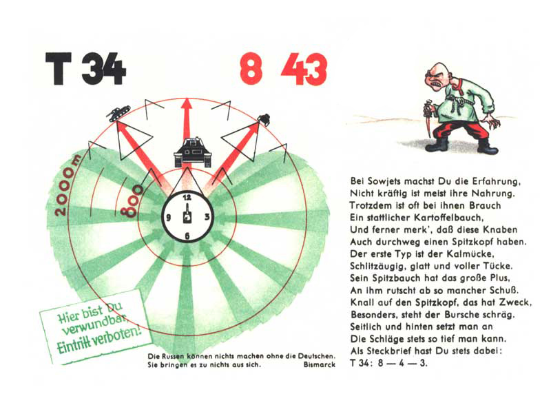 Základní charakteristiky ruského tanku T-34. Lahvičky s „medicínou“ říkají, že protitankový granát (Pz) se užívá vnitřně a tříštivotrhavý granát (Sp) zase zevně. Zásah do černě vybarvených míst tanku znamená průnik střely a vnitřní účinek. Šrafovaná místa znamenají vnější účinek a bílá zóna jsou místa kde se střela odrazí nebo tank jen pochroumá, ale nezničí/nevyřadí. Údaje v zelených rámečcích pak ukazují maximální vzdálenost pro efektivní palbu na danou část tanku.