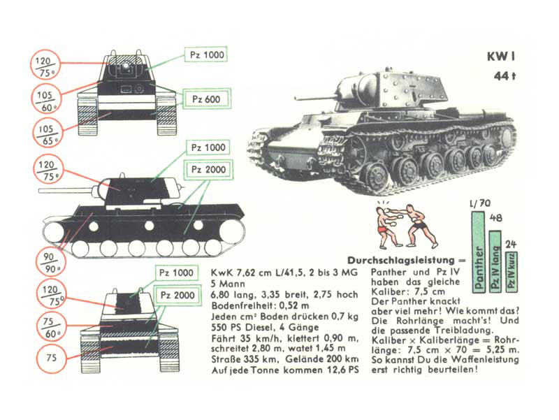 Parametry a vlastnosti sovětského tanku KV-1. I když mají KV-1, Panzer IV a Panther všichni shodně kanony ráže 75 mm, Panther ty ostatní dva svými výkony výrazně převyšuje. Je to díky jeho dlouhé hlavni. Její délka je 70 násobků ráže, tedy 70 x 7,5 cm tj. 5,25 metru.