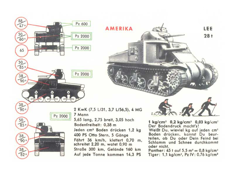 A teď z Ruska do Ameriky k tanku M3 Lee. Kromě jeho parametrů shrnuje však tato stránka také význam měrného tlaku na půdu. Tento ukazatel hraje velkou roli při posuzování zda ty, nebo tvůj protivník dokážete projet nějaký měkký terén. Např. 45 tun hmotnosti tanku Panther se rozkládá na plochu 5,5 metrů čtverečních což představuje měrnou zátěž 0,8 kg na cm2.