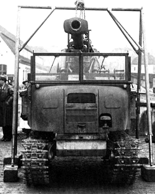 těžké polní dělo sIG 33 ráže 150 mm na podvozku tahače RSO, ani zde není úplně jasné, zda mělo skutečně jít o plnohodnotnou instalaci nebo jen ověření "přepravní kapacity", zdroj: Flickr.com se souhlasem publikujícího uživatele, upraveno