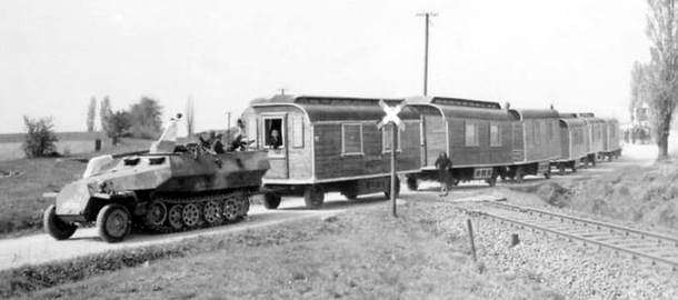 V lednu roku 1943 tak Panzerkompanie-Z obdržela rozkaz, aby se ihned připravila k přesunu do Itálie, odkud měla pokračovat lodí do Tuniska. Vojáci si sbalili své kostýmy, paruky, líčidla a žertovné nosy, hrazdy, kruhy a bubny a po měsících nudy celkem rádi vyrazili směrem na jih. Přesun do Itálie byl stejně nestandardní jako celá Panzerkompanie-Z. Jednotka totiž necestovala vlakem, jak bylo obvyklé, ale po vlastní ose tak, jak byli cirkusáci zvyklí cestovat celý život. Není třeba to příliš popisovat, stačí se podívat na vzácnou fotografii výše, která se nám z tohoto přesunu jako zázrakem dochovala v německých archivech.